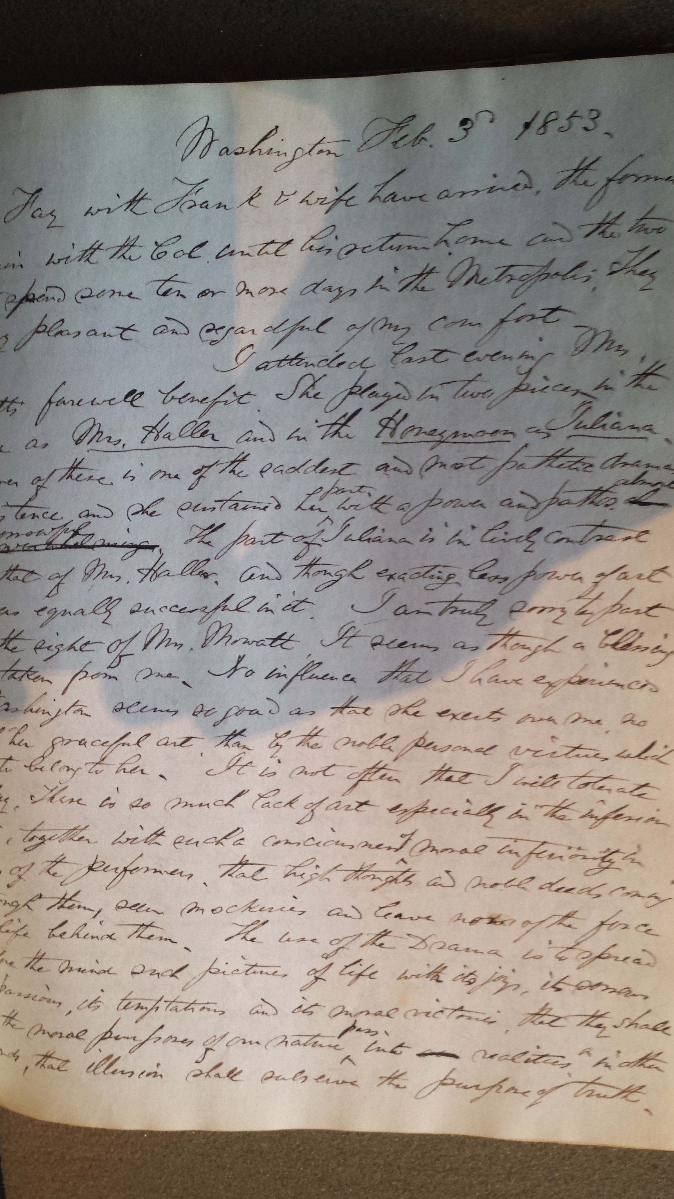He tried to take the news in stride, although he veered into the sentimental pretty quickly. Mowatt, he imagined, would “make his [her husband’s] house in Richmond a Paradise, probably, although in the slang phrase of the day, ‘you can’t always tell.’ I think I would risk my happiness in such a feminine keeping, were it ten years younger* Where Mrs. Mowatt goes, my peace, happiness and content go with her. (*i.e. were I disposed to trust my happiness to anything feminine – a trust often perilous).”