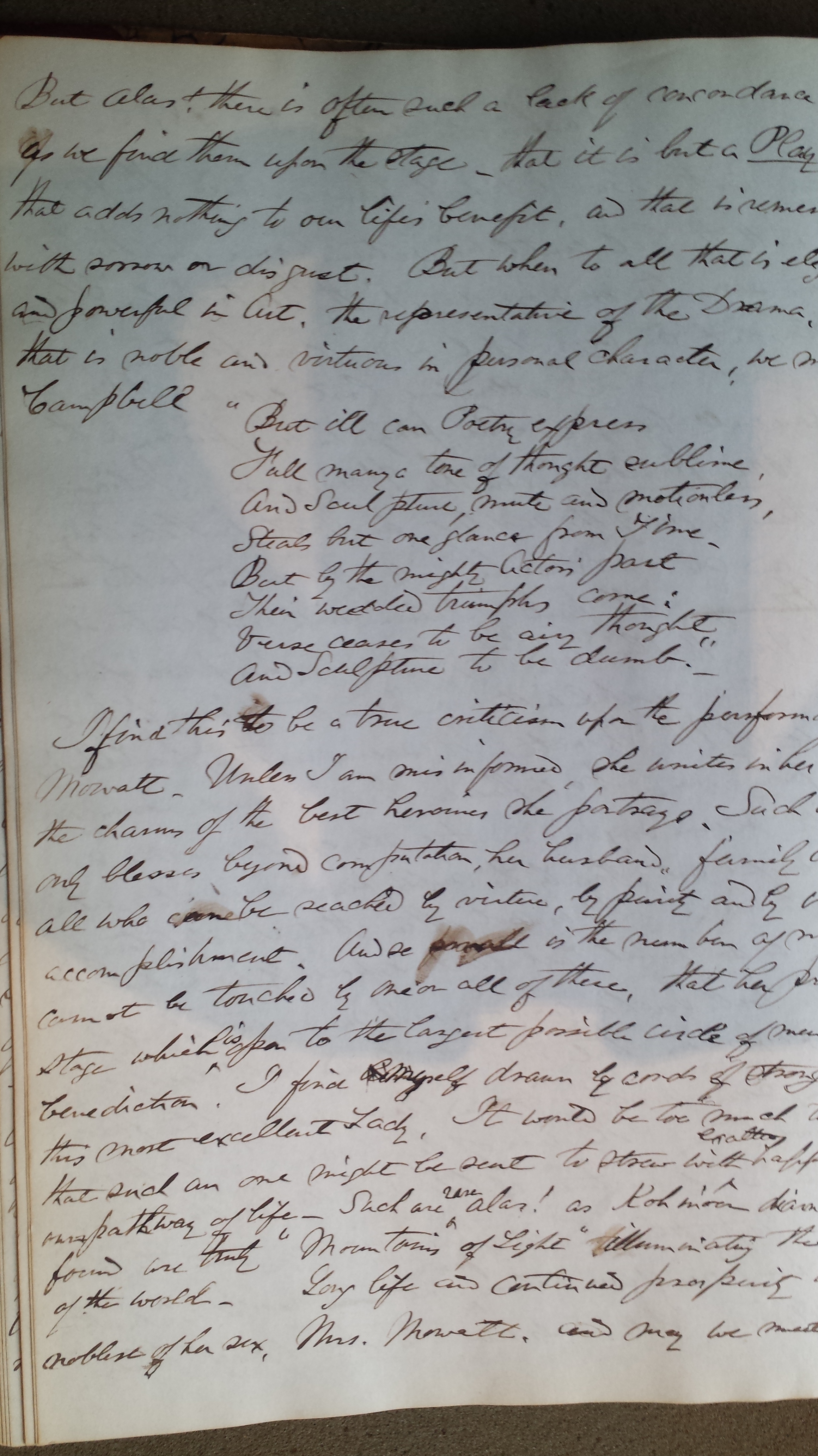 It certainly worked with Tracy Patch Cheever. He already thought the world of her, and her autobiography somehow raised that opinion even higher. He conceded that, “Under ordinary circumstances, the fair authoress would have subjected herself to much criticism, for the publishment of her life. It would have been deemed, the offspring of vanity & conceit.” But he totally bought Mowatt’s excuse that she was writing it as a final duty to her deceased first husband. After reading through her account of her struggles and triumphs, he pronounced that “The authoress is doubtless one of the first of her sex, in culture & force of mind, and in the moral beauty of her life.” A balanced, considered view, if there ever was one.