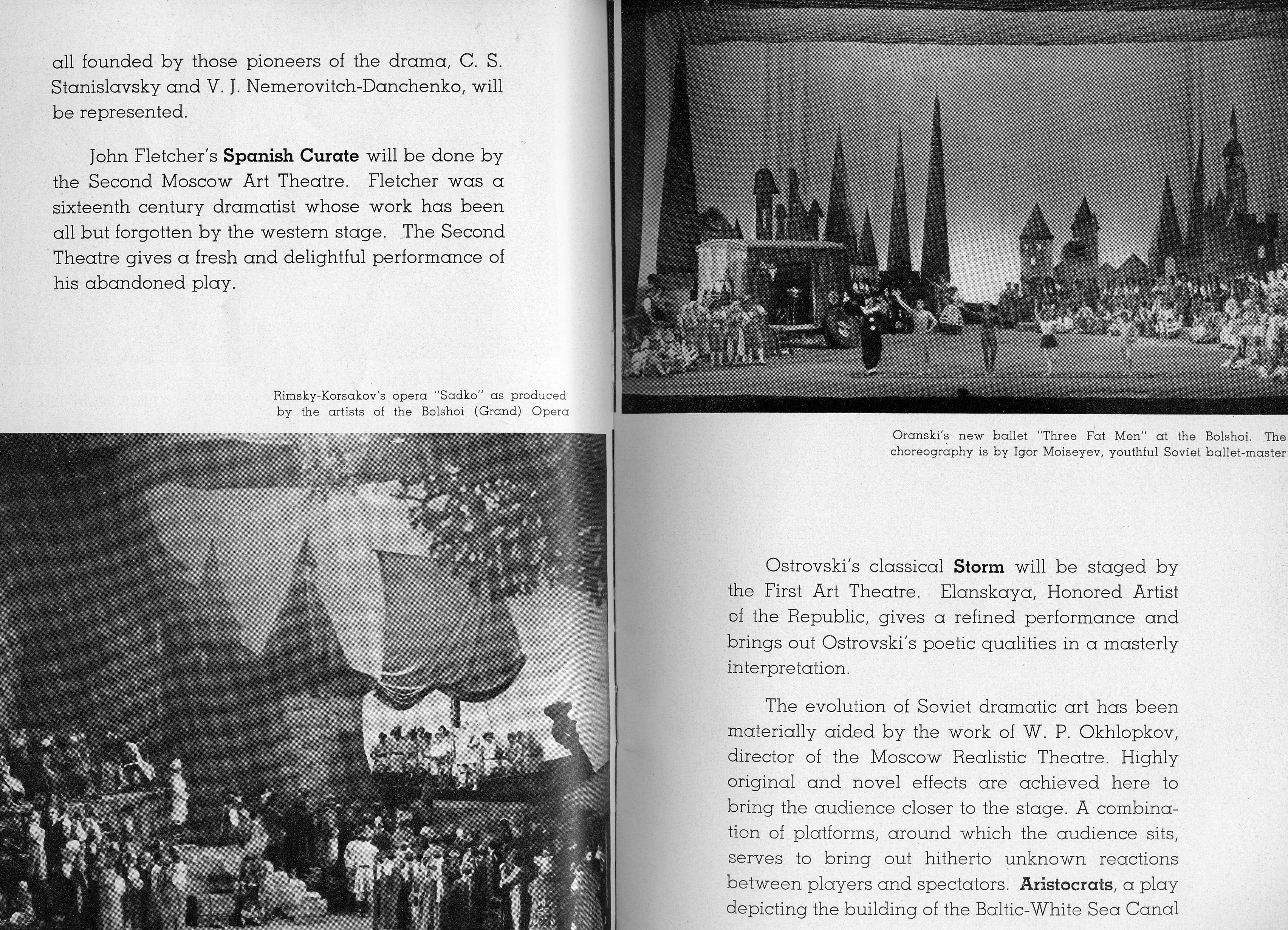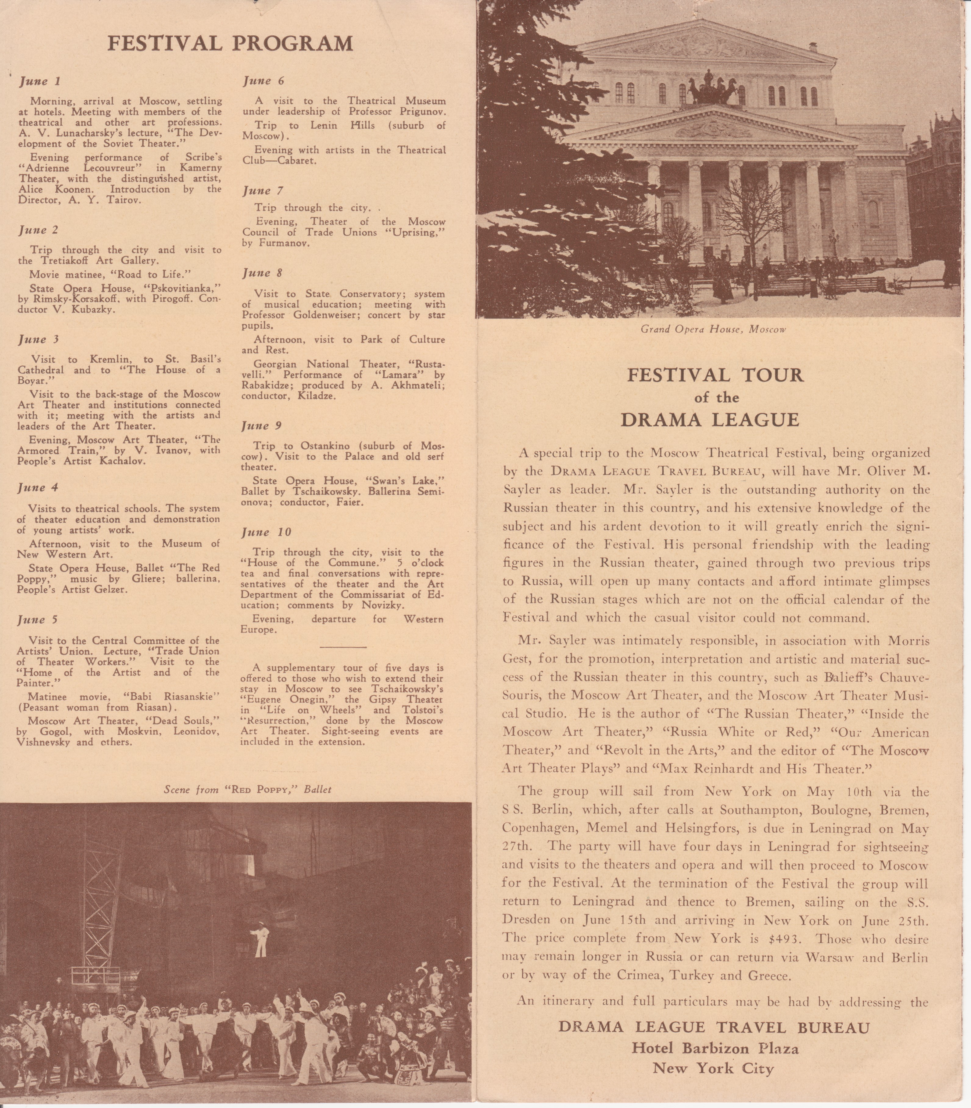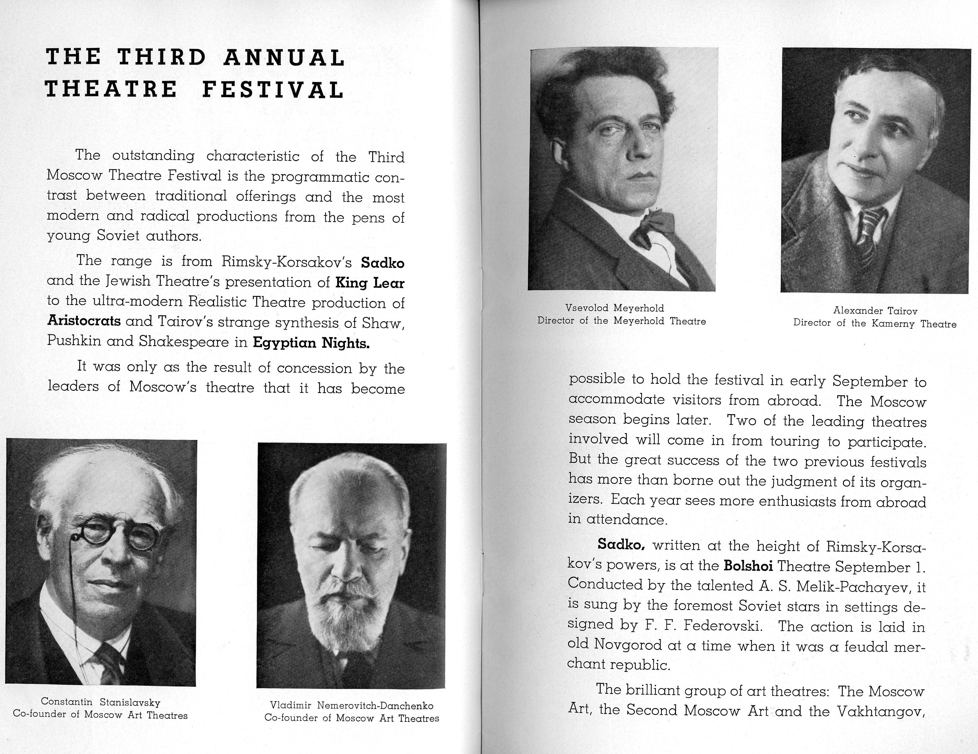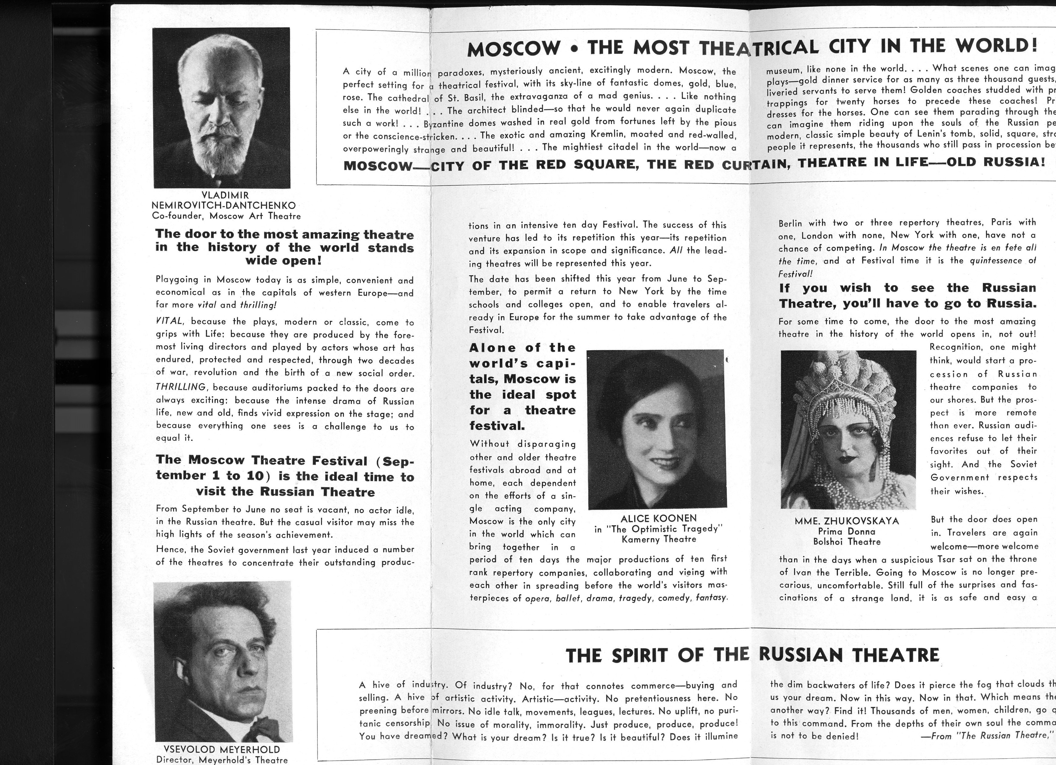 The tour offers prospective travelers a theatre-goer’s dream: the chance to see work by great directors such as Konstantin Stanislavsky, Vsevolod Meyerhold, and Nikolai Okhlopkov, among others. The glossy pamphlets feature fascinating images of many major theatrical figures and, most tantalizingly, production photos from the program on offer. The agendas for all three tours feature many productions at the Moscow Art Theatre, the famous home of Stanislavsky, who by this point had become a revered figure among American actors and directors, even though he hadn’t been at the cutting edge of Russian theatre for years. There were other attractions, too, such as the exoticism of Aleksandr Tairov’s Kamerny Theatre or the vaunted Russian ballet and opera.