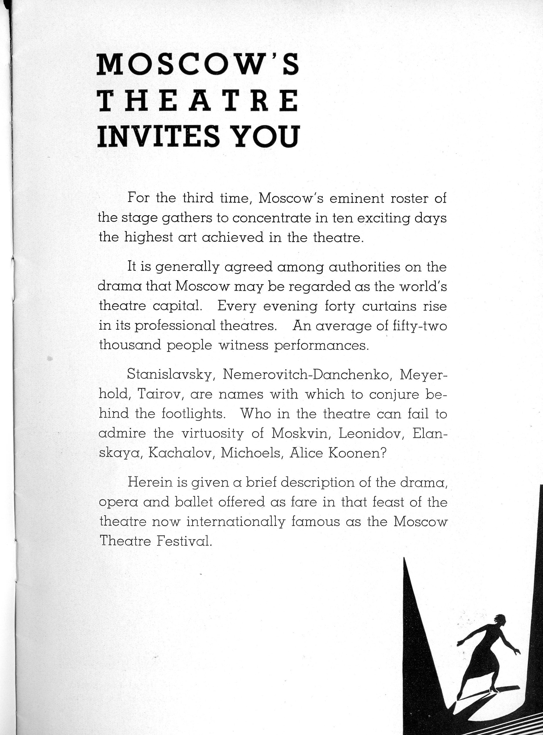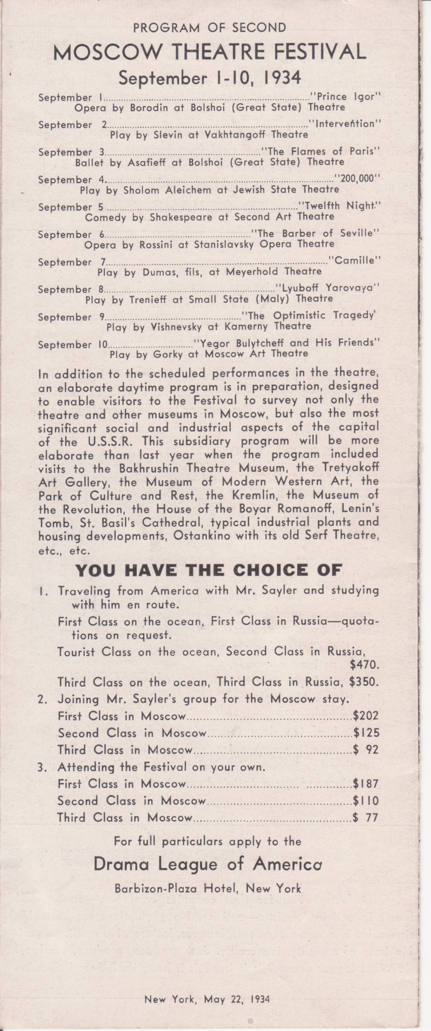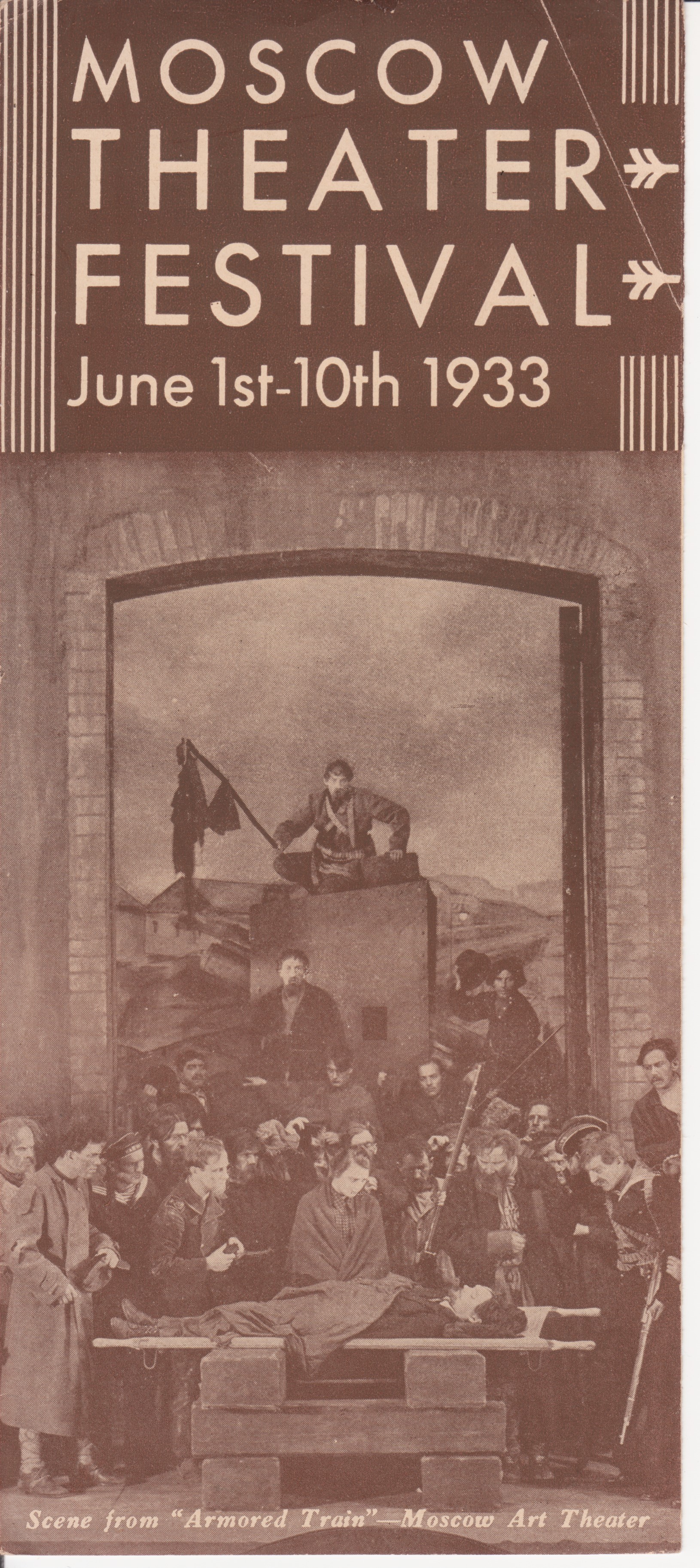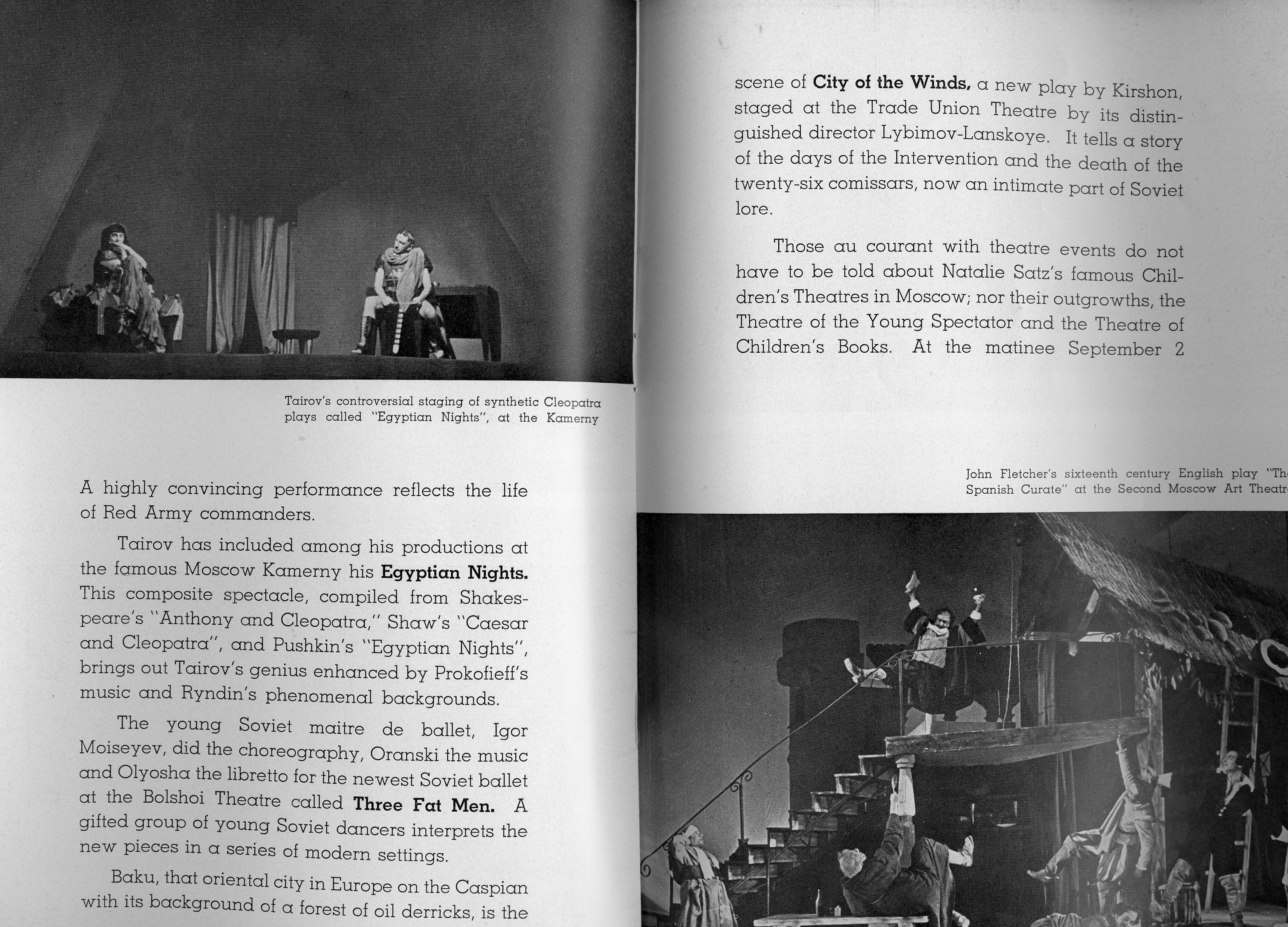 The tour offers prospective travelers a theatre-goer’s dream: the chance to see work by great directors such as Konstantin Stanislavsky, Vsevolod Meyerhold, and Nikolai Okhlopkov, among others. The glossy pamphlets feature fascinating images of many major theatrical figures and, most tantalizingly, production photos from the program on offer. The agendas for all three tours feature many productions at the Moscow Art Theatre, the famous home of Stanislavsky, who by this point had become a revered figure among American actors and directors, even though he hadn’t been at the cutting edge of Russian theatre for years. There were other attractions, too, such as the exoticism of Aleksandr Tairov’s Kamerny Theatre or the vaunted Russian ballet and opera.