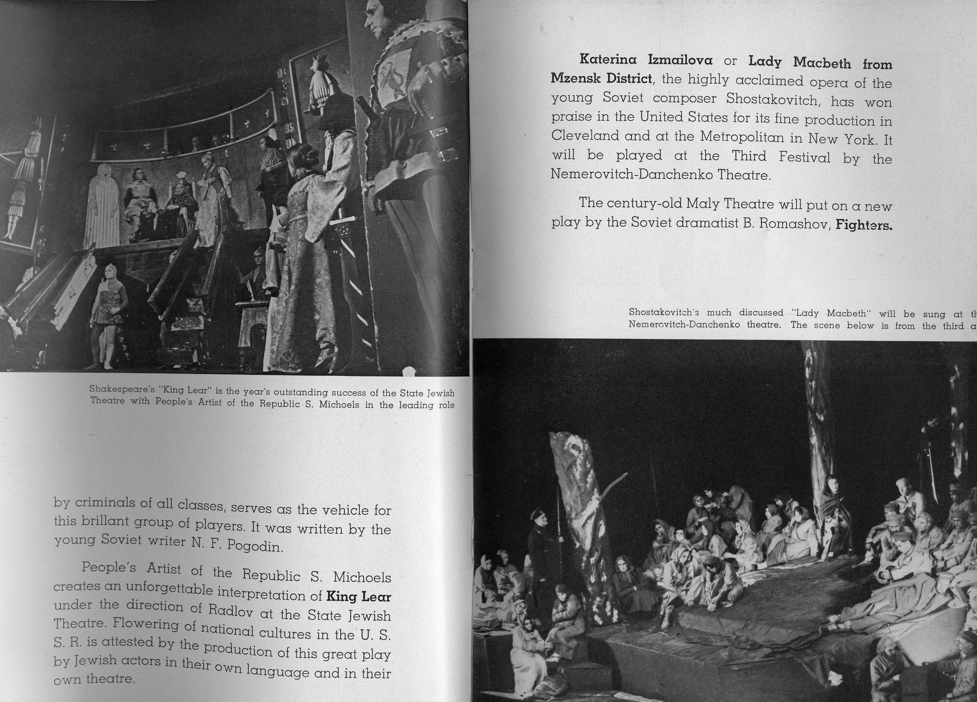 The fate of people like Meyerhold, and the hidden history behind plays like Aristocrats, point to what I ultimately find so troubling about these pamphlets: they’re a tantalizing glimpse, for theatre lovers both then and now, of an intriguing period in the development of a particular theatrical culture that helps to elide the horrors of the Soviet era. I can’t help but be fascinated by the images and descriptions of the plays and experiences offered on these tours, and I assume that those who went on these tours felt the same way. With the benefit of hindsight, it’s easy to judge those people for buying into a system that led to the deaths of millions, but I worry that we’re just as susceptible to looking the other way when placed in situations like theirs. We want to believe that cultural events like the Moscow Theatre Festivals of the 1930s offer the hope of greater understanding between nations, but there’s always a risk that they will instead help to cover up the atrocities of those in power.