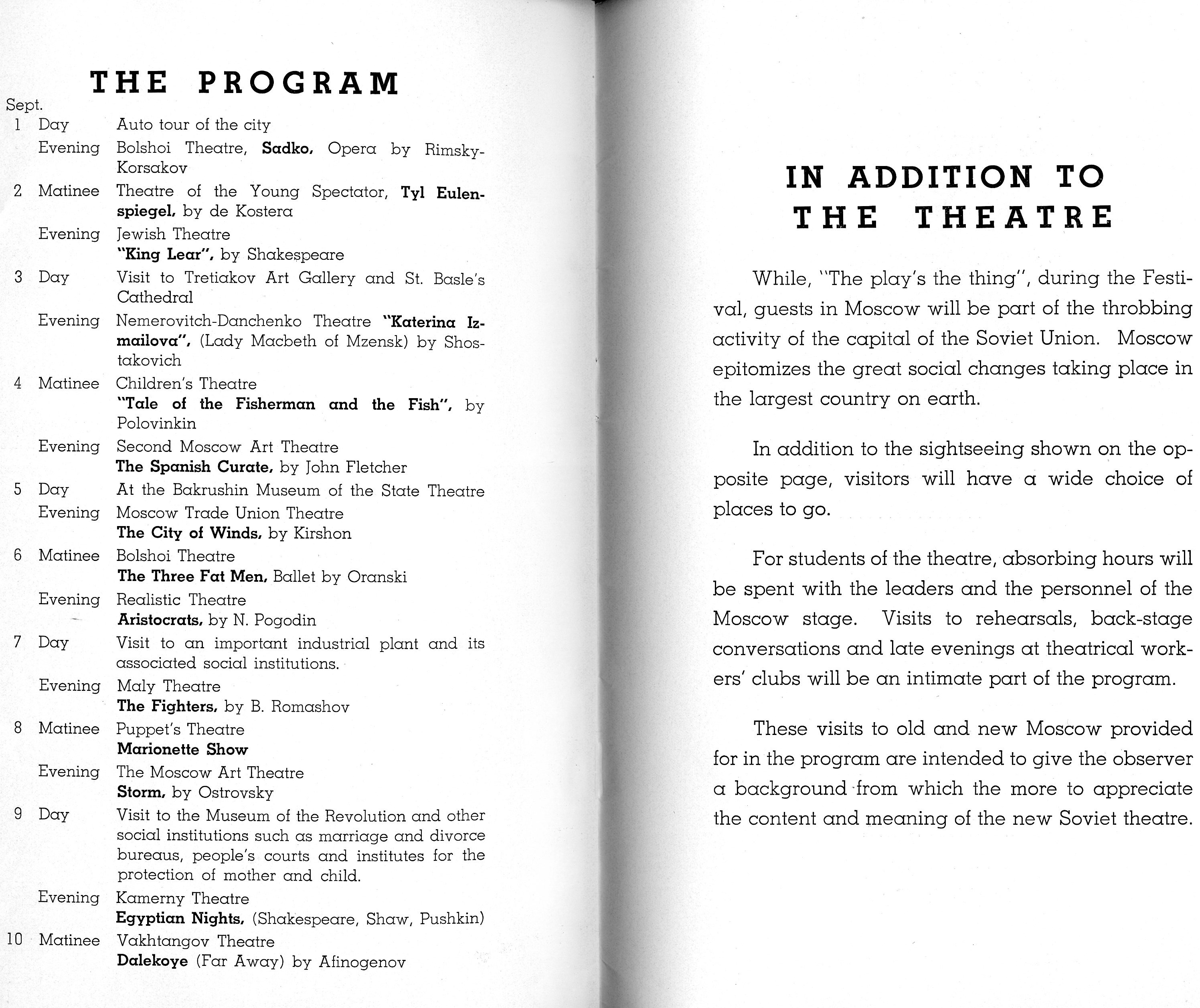 There are other items on the three tours’ schedules that don’t immediately relate to theatre. For instance, the agenda for September 9, 1935, is a “Visit to the Museum of the Revolution and other social institutions such as marriage and divorce bureaus, people’s courts and institutes for the protection of mother and child.” It’s pretty clear that there was an obvious motive on the part of Stalin to use these trips for propaganda purposes, and not only in the sense of showing off the theatrical culture of 1930s Russia.