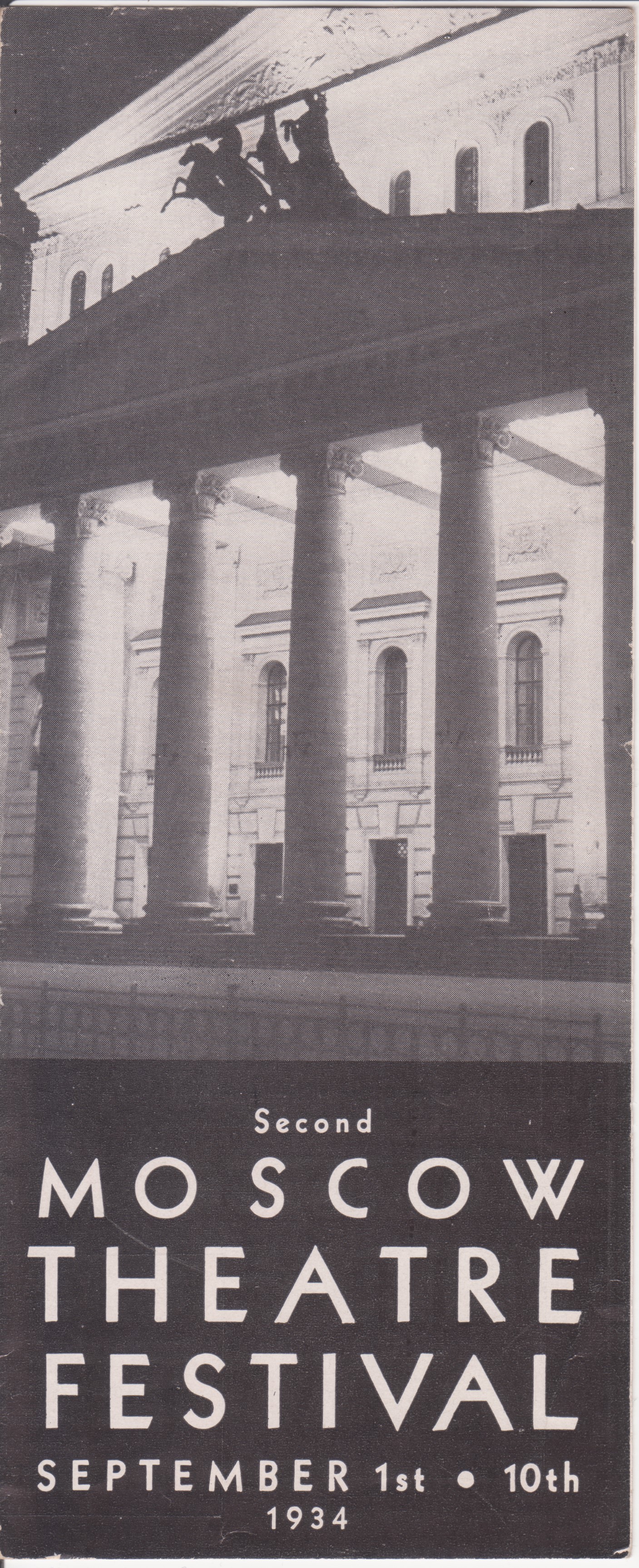 This fascination in the United States with the Soviet theatre is illustrated by the three pamphlets (a gift from my dissertation advisor) that I’m featuring in this blog post. They advertise the opportunity to take guided tours of the Moscow Theatre Festival (spelled “theater” the first year) in 1933, 1934, and 1935, respectively. On one level, they’re simply fascinating documents of the Russian stage, since the tours encompassed most of the significant theatrical movements in the country at the time. However, a closer examination of the content of these pamphlets (combined, admittedly, with the benefit of historical hindsight) brings to light some more disturbing truths.